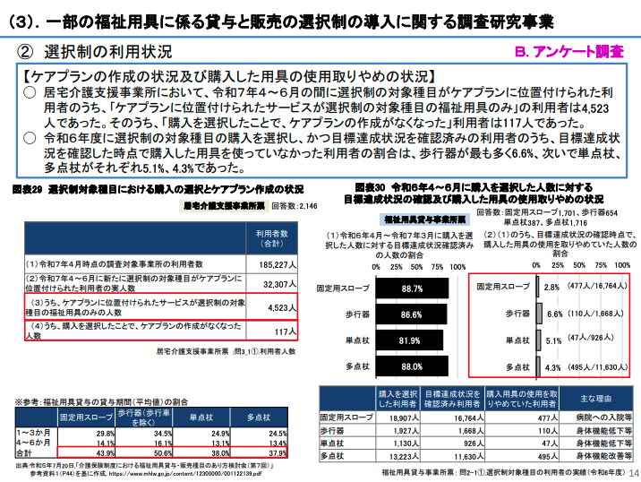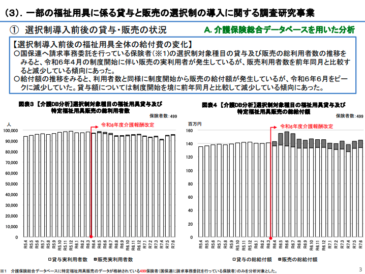 資料1-3では、令和6年4月に導入された福祉用具4種目(つえ、歩行器、固定用スロープ、歩行補助つえ)の貸与・販売選択制について、導入後の状況が報告されました。