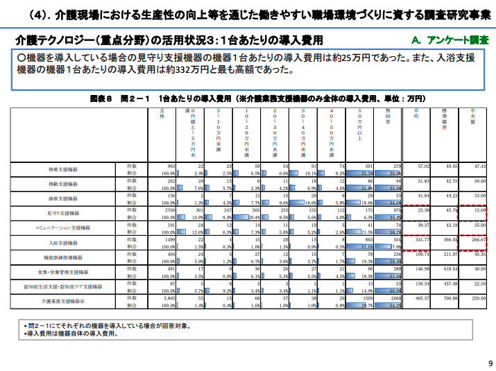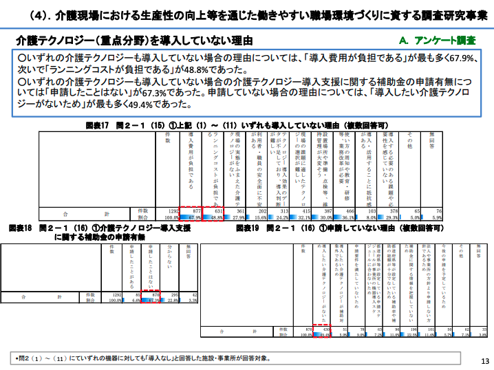 ところが、加算の算定率は低水準にとどまっています。特養における加算1の算定率は2.8%にすぎません。テクノロジーを導入していない理由としては「導入費用が負担である」が67.9%で最多、次いで「ランニングコストが負担である」が48.8%を占めました。見守り機器は1台平均約25万円、入浴支援機器は1台平均約332万円と高額であり、踏み出せない事業所が多い実態が浮かび上がっています。