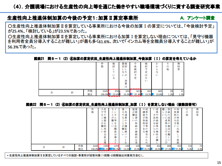 なお、加算2を算定している事業所のうち、上位の加算1への移行について「今後検討予定」は25.4%、「検討している」は23.6%にとどまり、見守り機器の全利用者分導入(未導入理由の61.6%)やインカムの全職員分導入(同56.3%)といった要件がハードルとなっています。介護助手の活用についても39.0%の事業所が導入済みで、主な業務内容は「清掃・片付け・ごみ捨て」が84.1%で突出して多く、次いで「リネン交換・ベッドメイク」が68.7%。活用による変化として「介護職員の身体的負担軽減につながった」との回答が78.5%に上っています。