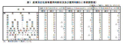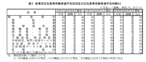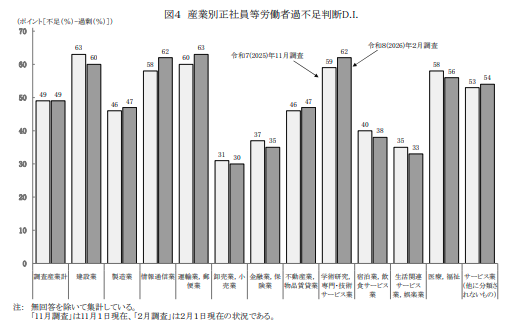 パートタイム労働者でも+34ポイントと、「サービス業(他に分類されないもの)」(+49)、「宿泊業,飲食サービス業」(+41)に次ぐ高さを維持しています。前回11月調査と比較すると、正社員等は+58→+56でわずかに低下、パートタイムは+34→+34で横ばいでした。