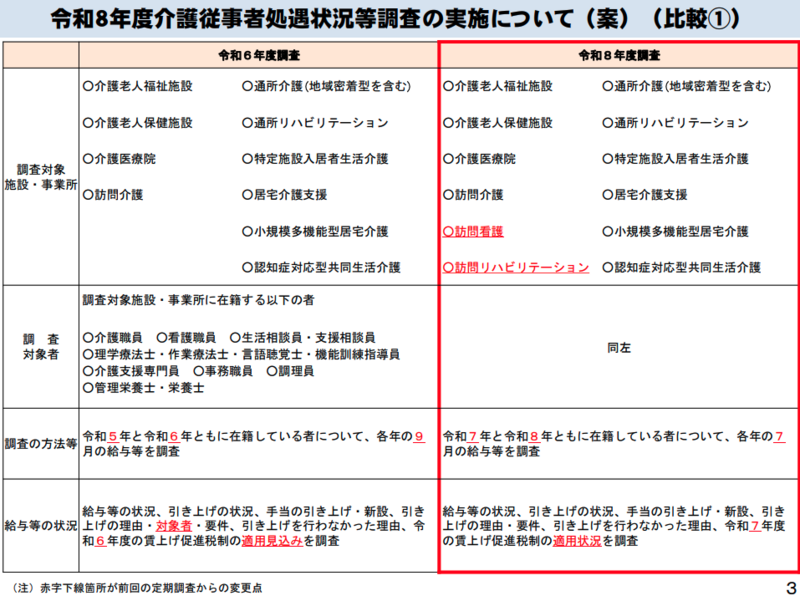 令和8年度の介護報酬改定により、介護職員等処遇改善加算の対象サービスが拡大されました。訪問看護と訪問リハビリテーションが新たに加算対象となったことを受け、今回の調査ではこの2サービスを調査対象に追加しています。居宅介護支援事業所は従来から対象に含まれており、引き続き調査されます。