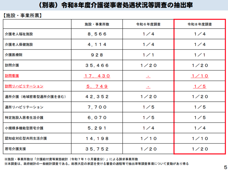 ※抽出率とは、全体の事業所・職員のうちどれだけの割合を調査対象として抜き出すかを示す数値です。「1/5」なら5カ所に1カ所が対象、「1/1(全数調査)」なら対象となった事業所の該当職種の職員全員が回答対象となります。