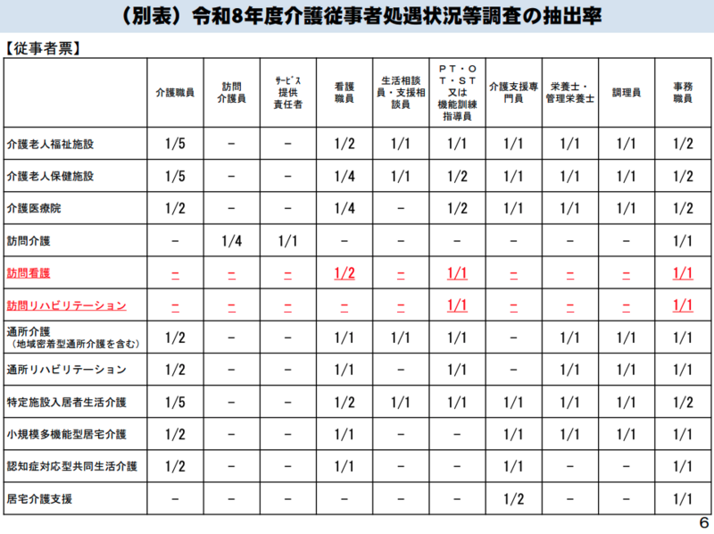 抽出率は、訪問看護が施設・事業所ベースで10分の1、訪問リハビリテーションが5分の1。従事者票では、訪問看護の看護職員が2分の1抽出であるのに対し、リハ職や事務職は全数調査(1分の1)となっています。訪問リハビリテーションについても、リハ職・事務職ともに全数調査です。
