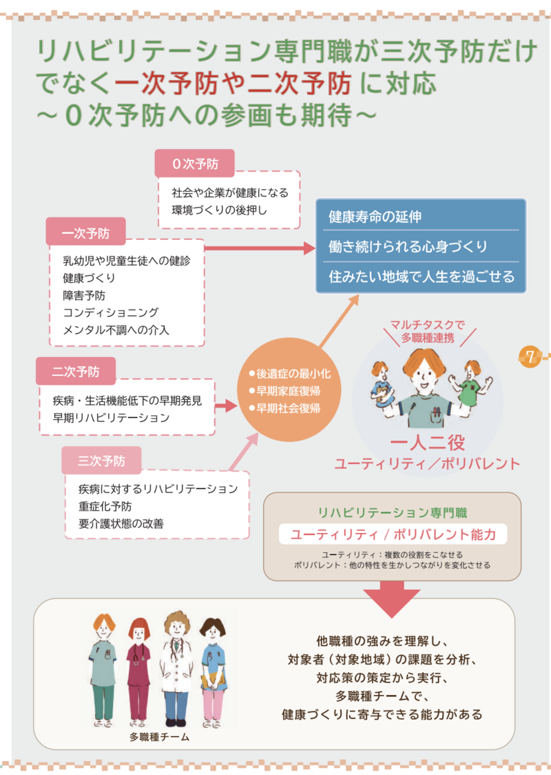 手引きが想定するリハ専門職の役割は、3次予防(疾病に対するリハビリテーション、重症化防止・復帰改善)にとどまりません。0次予防(社会そのものを健康にする仕掛け)、1次予防(気軽に受けられる体づくり、住みたい地域で人生を過ごせる)、2次予防(疾病・生活習慣病の早期発見・早期リハ)まで、「健康寿命の延伸」を軸に参画領域を広げる構成です。