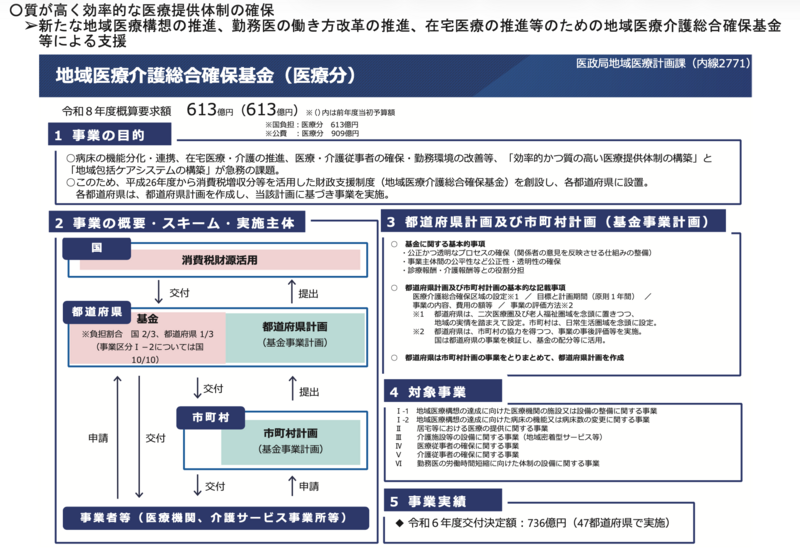 今回の法改正では、地域医療介護総合確保基金(医療分)に業務効率化・勤務環境改善支援の新区分を設けることが想定されています。現行の同基金は地域医療構想の推進や医療従事者の確保など6区分(Ⅰ-1、Ⅰ-2、Ⅱ〜Ⅵ)で運用されており、令和8年度概算要求では国負担613億円が計上されています。これに先行して、令和7年度補正予算では「医療分野における業務効率化・職場環境改善支援事業」(200億円規模、1施設あたり最大8,000万円/※POST既報 https://1post.jp/8245 )が実施されています。