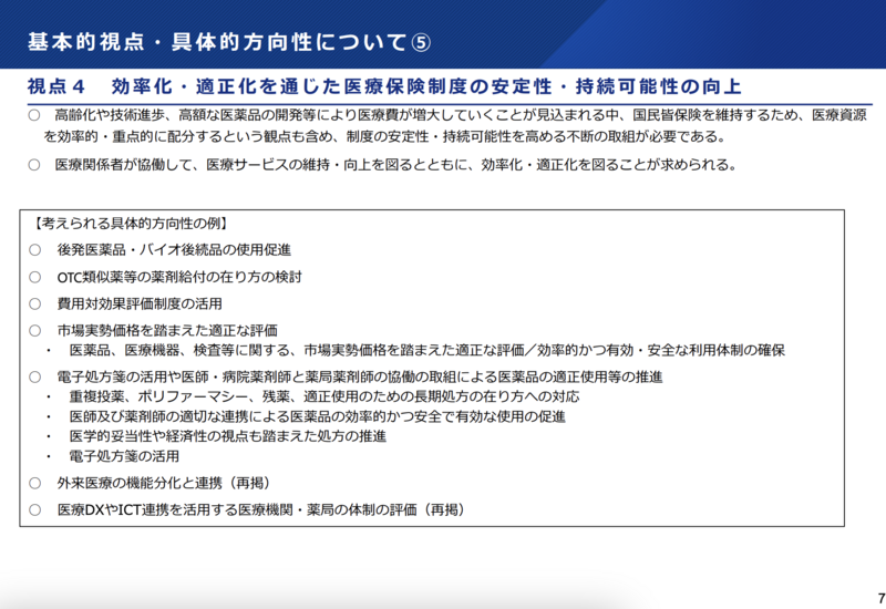 また、「視点1から4のいずれも密接に関係する重要なテーマであり、どれか一つを重点課題にするということではないべきだ」との意見や、「医療機関の再編統合による経営基盤の安定化や、急性期病院の集約化もしっかり記載すべきだ」との提案もなされた。