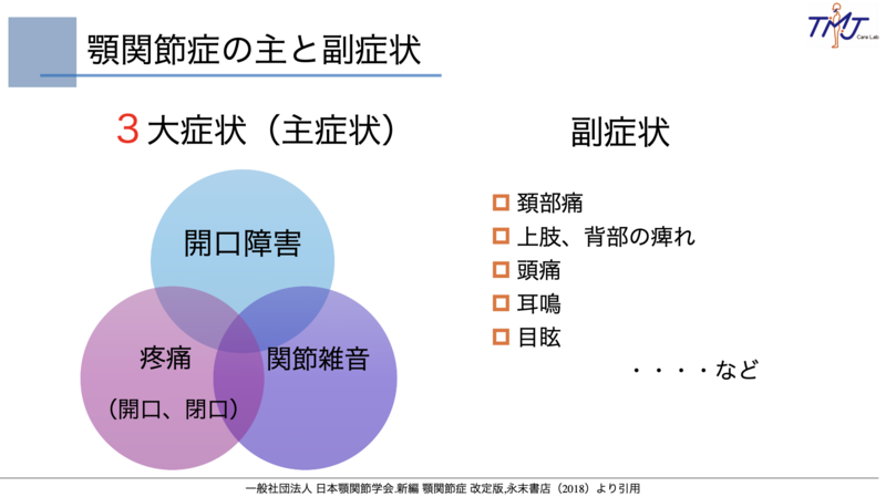 これらの症状があり、同時に顎関節に何らかの症状や所見がある場合は、顎関節症が原因の一つになっているかもしれません。
