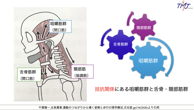 また、顎関節に関与する筋肉は、頚部や肩・肩甲帯、さらには全身の姿勢や運動に関わる筋肉と複雑につながっています。