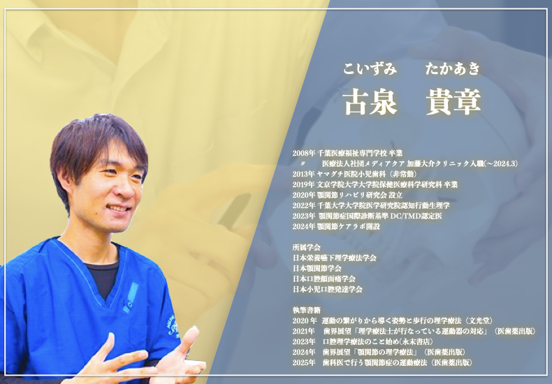 整形外科クリニックで15年勤務されている傍ら、10年以上複数の歯科医院に非常勤勤務している日本でも珍しい理学療法士。現在も歯科医院で勤務する傍ら、2024年より東京で顎関節ケアラボという自費リハビリサービスを提供している。