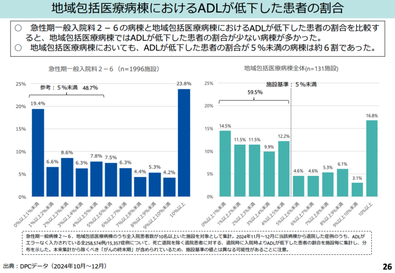 - 江澤和彦委員(日本医師会常任理事)は、「地域包括医療病棟では80歳以上の患者が3分の2を占める。ADL低下5%未満要件の維持は現実的でなく、リハ・栄養・口腔の連携評価と併せて見直しを行うべき」と述べました。