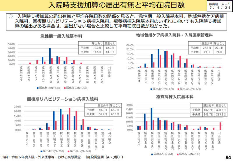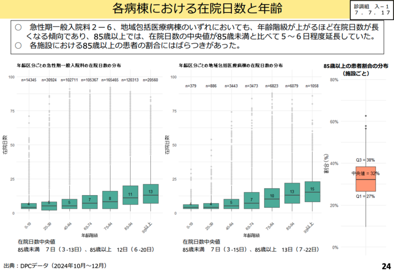同資料では、年齢が上がるほど在院日数が長くなる傾向も示され、85歳以上の患者では在院日数中央値が5~6日延びることが明らかになっています。