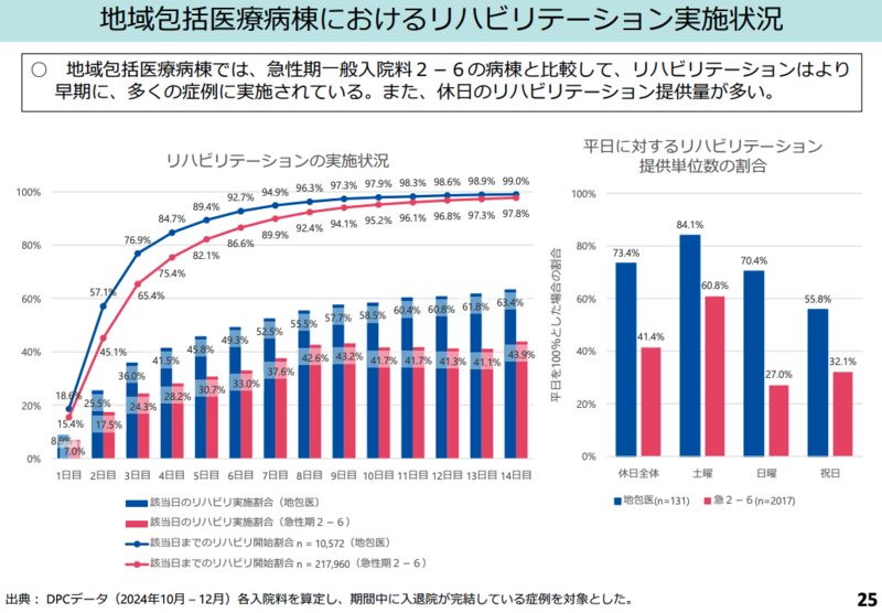 地域包括医療病棟は、高齢者の救急搬送を受け入れ、急性期治療からリハビリテーション、在宅復帰支援までを一体的に提供する病棟として位置づけられています。厚労省が示したデータによると、休日リハビリの提供量は急性期一般2~6病棟より多い一方で、退院時ADL低下5%未満という施設基準を満たす病棟は全体の6割未満にとどまっていることが報告されました。