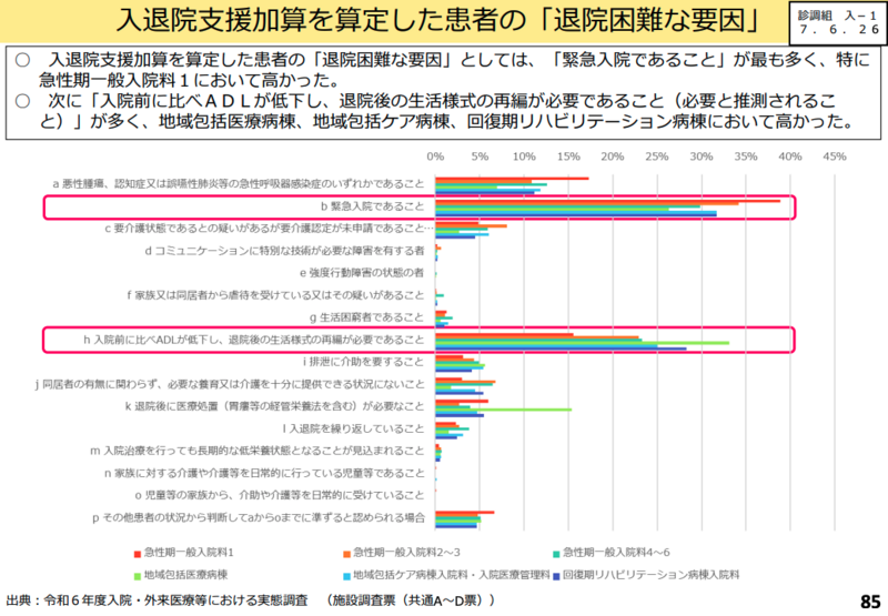 林課長は、地域包括医療病棟・地域包括ケア病棟では「ADL低下や生活再編が必要な高齢患者が多く、退院支援に人手と時間がかかる」と説明しました。資料では、退院困難要因の最多は「緊急入院」であり、次いで「ADL低下に伴う生活様式の再編」が多いことが示されました。