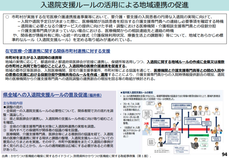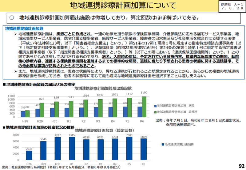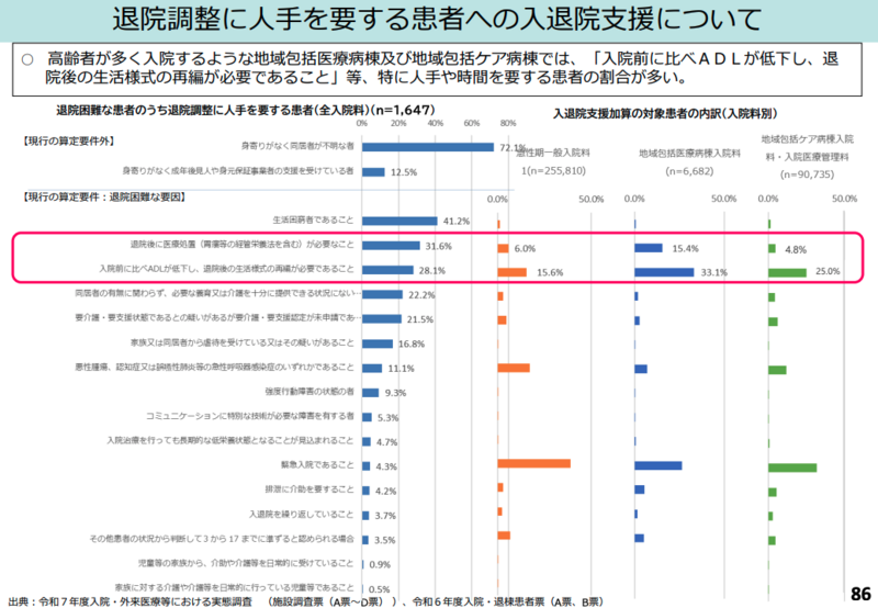 また、退院困難要因に「身寄りのない患者」や「要介護区分変更申請が必要な場合」を追加する案が示され、異論は出ませんでした。 併せて、地域連携診療計画加算で検査・画像情報を添付した情報提供を評価する案、および市町村が策定する入退院支援ルールを活用した支援の評価も提示されています。
