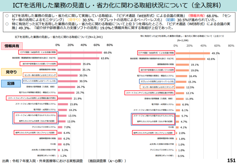 看護職員の負担軽減策として、ICT機器導入による業務効率化を前提に、入院料の看護配置を柔軟化することができないかという論点も挙げられました。資料では、見守りカメラ、タブレット入力、音声入力システムなどの活用による業務時間短縮事例が紹介されています。