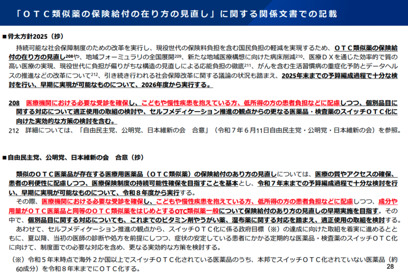 議題の後半では、資料1-2「薬剤給付のあり方について」に基づき、OTC(一般用医薬品)類似薬の保険給付の是非が議論されました。厚労省は、骨太方針および三党合意の中で定められた以下の3要素に沿って検討を進めていると説明しました。