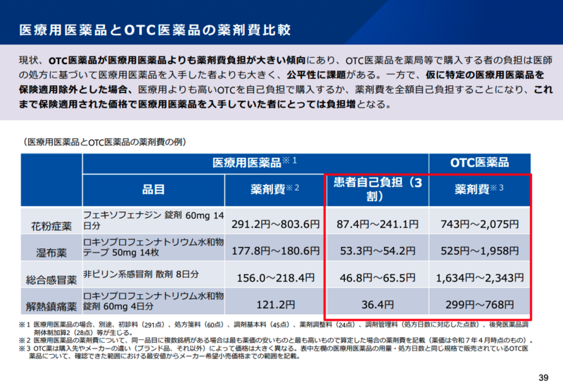 委員からは、「OTC薬を保険給付から除外すれば、結果的に自己負担が増える」との指摘が相次ぎました。資料では、医療用薬品とOTC薬品の薬剤費を比較した表が提示され、「同成分であってもOTC薬のほうが高額になる傾向」が示されています。