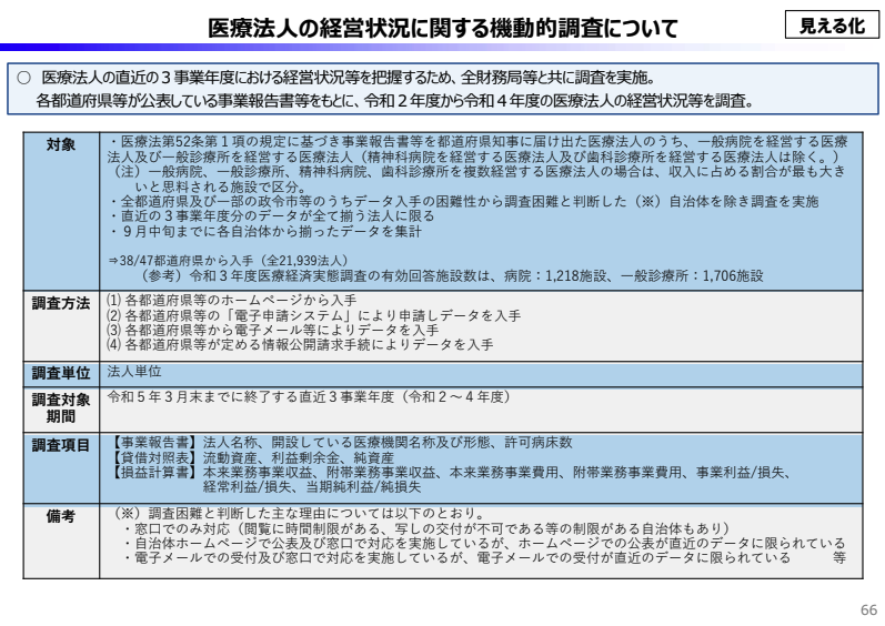 この現状を打破すべく、財務省は2023年、全国の財務局を動員した独自の「機動的調査」を敢行した。医療法人が都道府県に提出する事業報告書を直接収集・集計することで、約2万2000法人(うち無床診療所は約1.8万法人)という、従来とは桁違いのデータを確保したのである。
