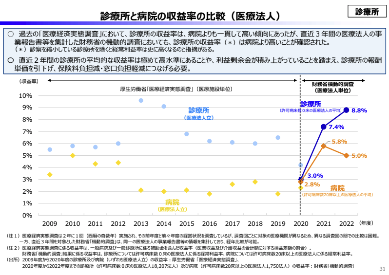 この調査結果として「診療所の経常利益率は8.8%(2022年度)、病院は5.0%と、診療所が極めて良好」というデータが示され、財務省は診療所報酬の単価引き下げを強く要求した。