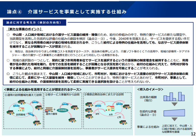厚労省は、人口減少地域で介護サービスを維持するための新たな事業枠組みを提案した。市町村が介護保険財源を活用して、訪問範囲の拡大や複数自治体の連携を柔軟に行えるようにするもので、地域支援事業の一類型として実施を想定している。