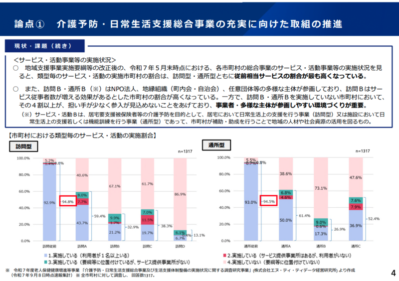 介護予防・日常生活支援総合事業については、訪問型・通所型ともに「従前相当サービス」が依然9割を占め、訪問型B・通所型Bの導入が進まない現状が報告された。