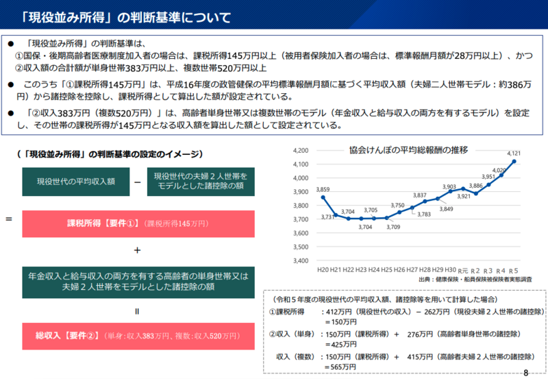 厚生労働省は会合で、後期高齢者の3割負担の対象となる「現役並み所得者」の基準について、時点更新を含めた見直しを提案した。資料によると、現行の課税所得145万円という基準は平成16年の協会けんぽの標準報酬平均値(386万円)を基に設定されたものだが、直近では協会けんぽの平均総報酬が伸びてきているという。