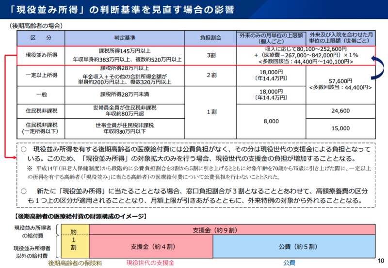財政構造図によると、現役並み所得者(3割負担)については医療給付費の公費の部分がなく、現役の支援金が当てられる構造になっている。これに対し、1割負担・2割負担の方は「1対4対5」(保険料:現役の支援金:公費)という構造だ。