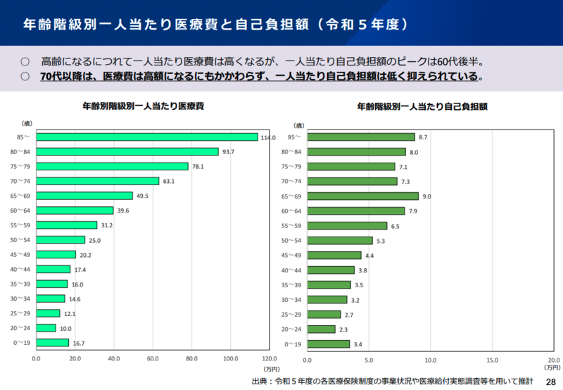 全国健康保険協会の北川博康理事長も同様の見解を示し、「受診状況、健康状態が改善傾向にあり、所得額も増加傾向にある一方で、現役世代の負担が年々増えている」と強調。1人当たり医療費の分布を引用し、「年齢が上がるにつれて増加という大きなトレンドはあるが、1人当たり自己負担額がそのようになっておらず、60代から70代で自己負担額に大きな差がある。この点にも着目しながら給付と負担のバランスについて検討をお願いしたい」と述べた。