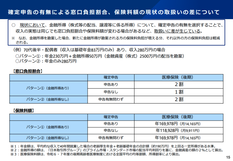 実例では、年金230万円と金融所得50万円の世帯が、金融所得を申告すれば窓口負担2割となるが、申告せずに源泉徴収で終われば1割負担となる事例が示された。