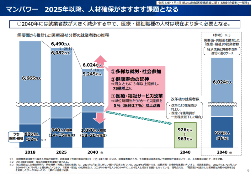 会合ではこのほか、医療機関の業務効率化や職場環境改善についても議論された。2040年に向けて医療福祉従事者の需要が全就業者の18〜20%まで増加する試算が示された。ただし、サービス提供体制改革による生産性向上を実現できれば16%に抑制できるとされており、業務のDX化推進が喫緊の課題として取り上げられた。