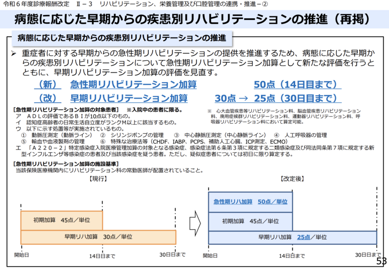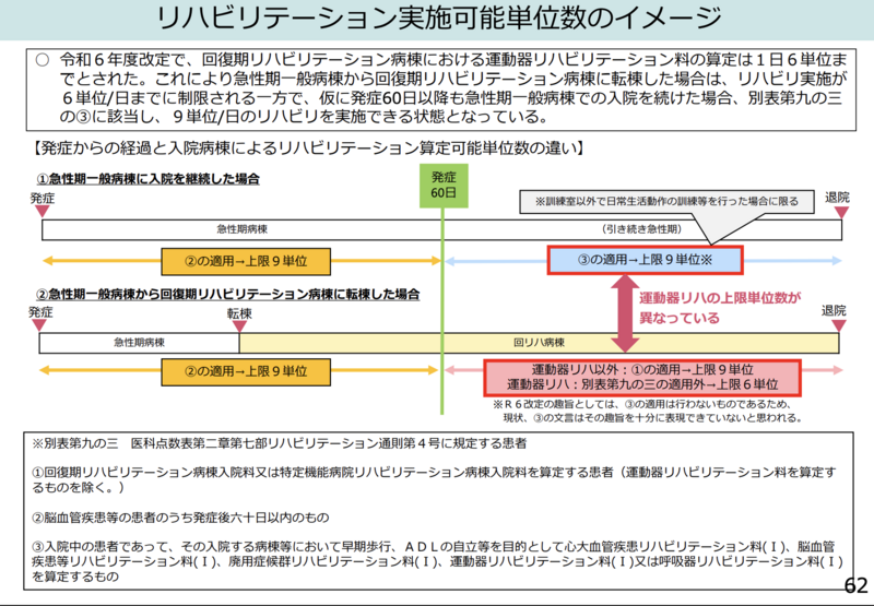 回復期は2024年度改定で「1日6単位」に整理されたが、急性期等では「1日9単位」まで算定可能とする規定が残り、運用が分かれたままだ。