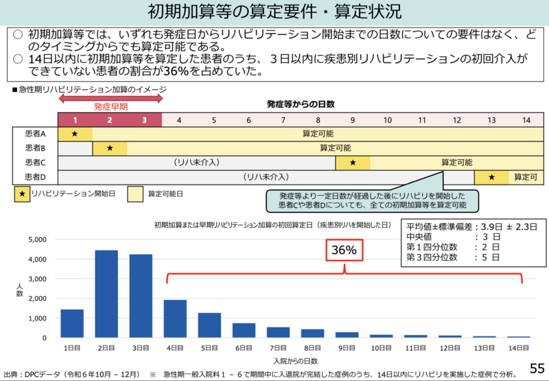 林課長は、【急性期リハビリテーション加算】や【早期リハビリテーション加算】に、「休日も含めて発症から3日以内の介入」といったことを評価要件として検討してはどうか、という方向性を示した。