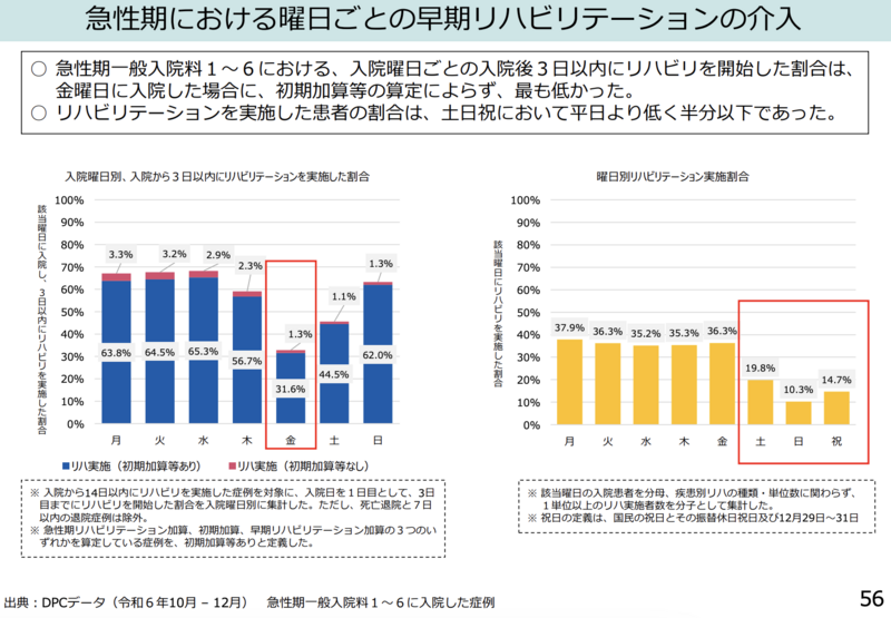 しかし実際のデータを細かく見ると、現行加算の“起点”である「開始日」に依存するため、4日目以降の介入が36%に達していた。特に、金曜入院では土日のリハ提供が少なく、介入が遅れやすい傾向も見て取れる。