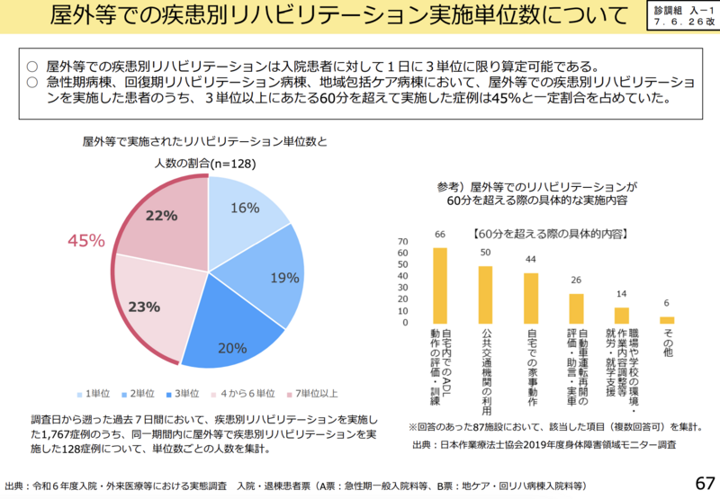 現行は「1日3単位まで」だが、実際にはそれ以上行われているケースも確認された。江澤委員は「長時間の院外リハビリが実施されている実態を踏まえた評価、つまりより多くの院外リハビリによる疾患別リハビリ料算定を可能とすべきです」と提案した。この点については、診療側・支払側とも同じ方向を向いており、院外リハビリの評価拡大が具体化する見通しだ。