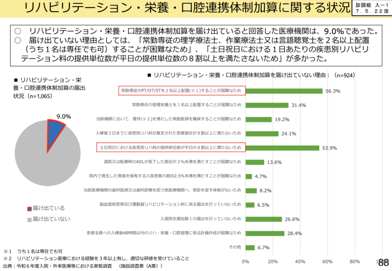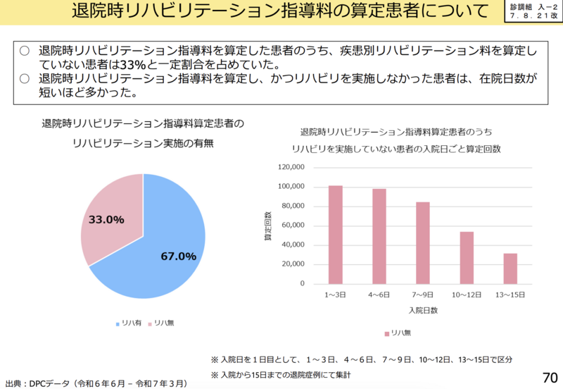 在院日数の短縮が進む中、「入院中リハなし」は想定以上に多い。そこをどう扱うかで制度の方向性は変わる。