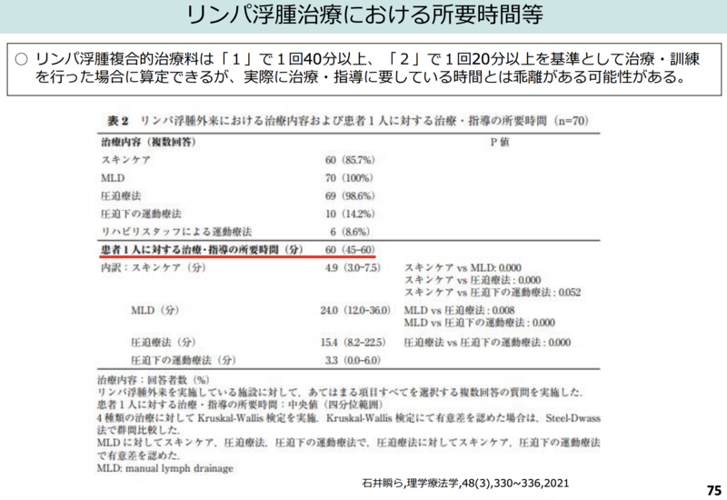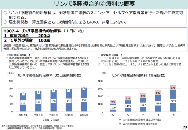 H007-4【リンパ浮腫複合的治療料】は、リンパ節郭清を伴う悪性腫瘍手術を行った患者などに対する複合的治療を評価する項目で、「1 重症の場合」(200点)は1回40分以上、「2 1以外の場合」(100点)は同20分以上の治療を評価している。しかし、林医療課長が示したデータでは、実際には「より長時間」のケアが行われていることが明らかになった。