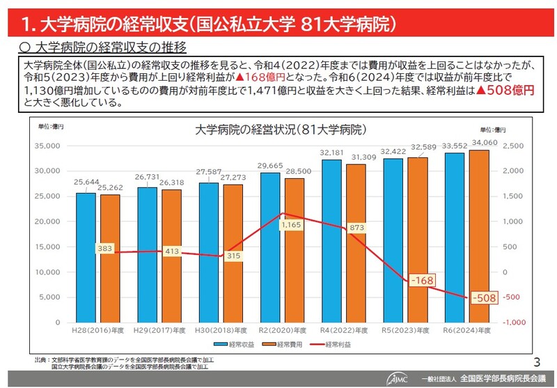 日本医師会の江澤和彦委員は「全国医学部長病院長会議の報告では、2024年度の全国81病院の経常損失額の総額は508億円に達している」と指摘。「特定機能病院が倒れてしまうと地域医療崩壊に直結する。役割や機能に応じて評価を切り分けるとしても、いずれの類型であっても十分に評価していくことが必要だ」と述べた。