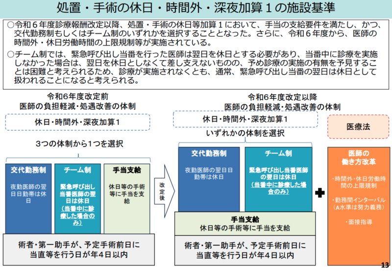 医師の診療科偏在への対応として、事務局は処置及び手術の休日・時間外・深夜加算1について論点を提示した。現行制度では、チーム制において緊急呼び出し当番を行った医師は翌日を休日とする必要があるが、当番中に診療を実施しなかった場合でも、予め診療の有無を予見することが困難なため、翌日を休日として扱うことが求められている。