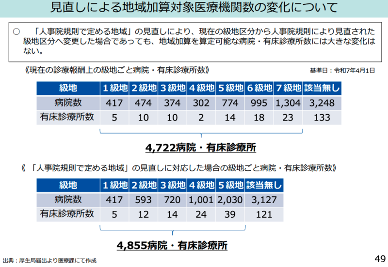 江澤委員は「級地区分の見直しにより、地域加算を算定可能な病院・有床診療所の数には大きな変化はないと記載されているが、現状の厳しい経営環境下においては、地域加算が下がる医療機関への支援を、経過措置などの特段の配慮は欠かせない」と述べた。