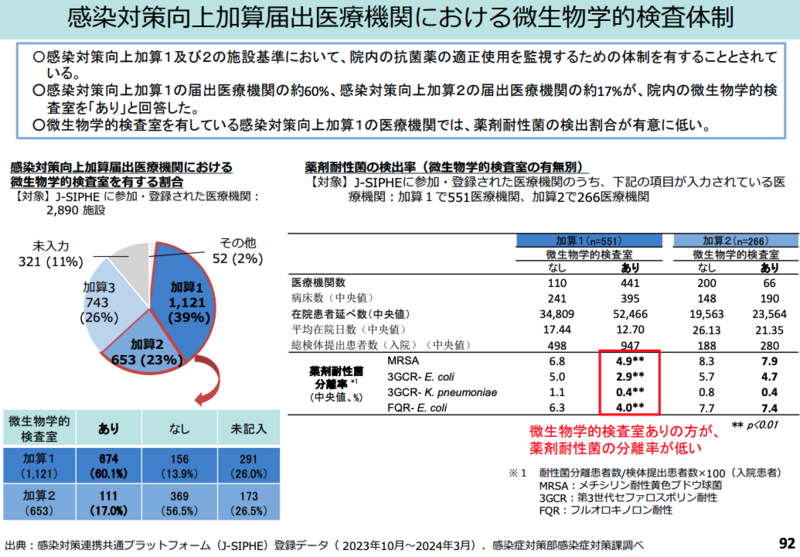 江澤委員は「検査室を有していない医療機関であっても、加算1の施設基準を満たし、地域の感染症対策においてすでにリーダー的な役割を果たしている。微生物学的検査室の設置を評価するとしても、加算1の要件とするのは時期尚早と考える」と述べた。「そもそも変更できない建物のハード部分を要件設定するのが診療報酬評価にはなじまないのではないか。微生物学的検査室を導入していない背景についても精査した上で検討すべきだ」との見解を示した。