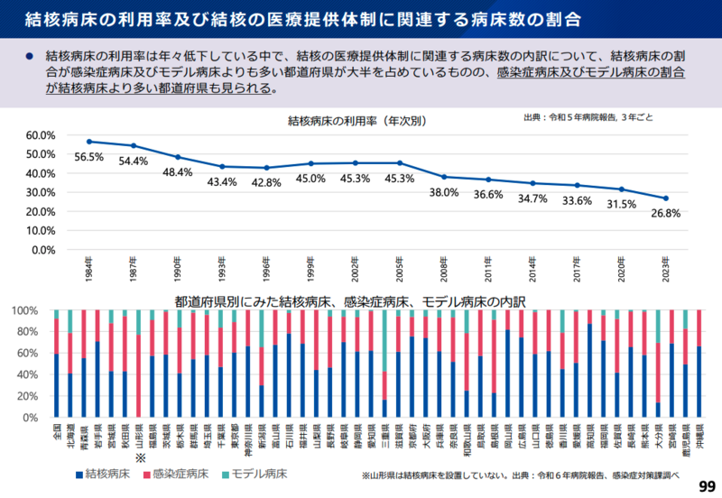 結核病棟のユニット化病床・モデル病床については、重症度・医療看護必要度や平均在院日数の扱いを見直すことが論点となった。事務局は、結核病棟の病床利用率が2023年に26.8%と極めて低く、年々低下傾向にあることを報告した。