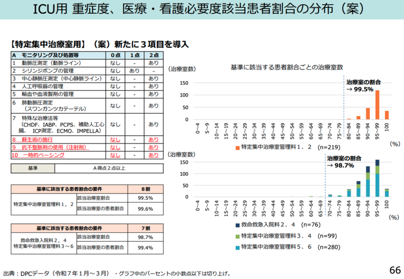 また、ICU(特定集中治療室)等の看護必要度についても、現場の実態に即して「蘇生術の施行」「抗不整脈剤の使用(注射剤)」「一時的ペーシング」をA項目に追加する案が示されました。これに伴い、支払側の松本委員は「項目が増えるのであれば、基準値も引き上げるべきではないか」と主張しましたが、診療側は「項目の追加による該当率の上昇はわずかであり、基準値の引き上げはあってはならない」と強く反論しています。