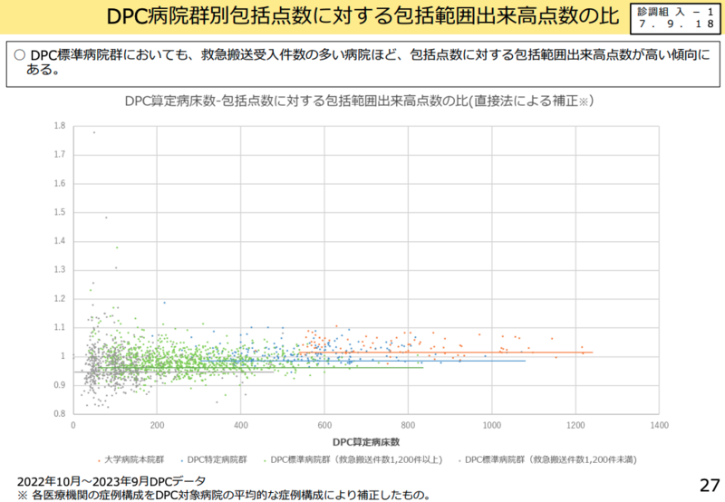 DPC制度の見直しについても、多岐にわたる論点が提示されました。特に注目されたのが、DPC標準病院群における「基礎係数」のあり方です。