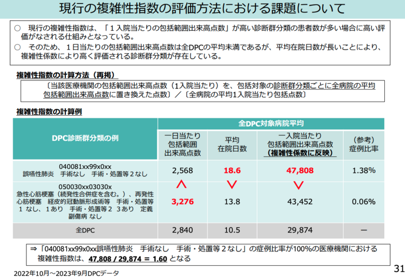 また、「複雑性係数」についても見直しが提案されました。現行は「1入院あたり」の包括点数で評価していますが、入院期間が長い誤嚥性肺炎などの症例が多い病院ほど係数が高くなる傾向があります。急性期医療を評価するDPCの趣旨に鑑み、「入院初期」の医療資源投入量を重視した評価体系への転換が検討されています。