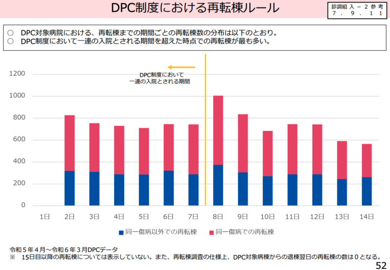 このほか、DPC病棟から転棟し、7日以内に再びDPC病棟に戻る「再転棟」について、ルール適用外となる「8日目」の転棟が不自然に多い実態が指摘されました。これに対し、「同一傷病による再転棟は、期間に関わらず一連の入院とみなす」といったルールの厳格化も検討されています。