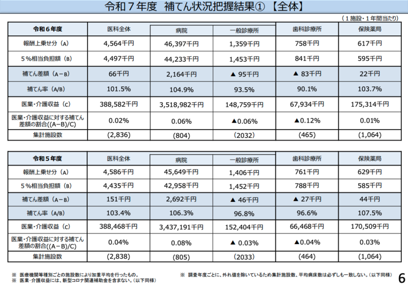 一方で、診療側からは強い懸念が示されました。小坂真理委員(日本医師会常任理事)は、「令和5年から6年にかけて補填率が下がっているトレンドがある。インフレ基調の中で、実質的にはマイナスになっていくのではないか」と指摘し、将来を見据えた対応を求めました 。また、太田圭洋委員(日本病院会副会長)も、病院団体独自の調査では補填率が100%を下回っていることに触れ、「厚労省の結果には正直驚きがある。なぜ乖離があるのか検証の場を作ってほしい」と要望しました 。