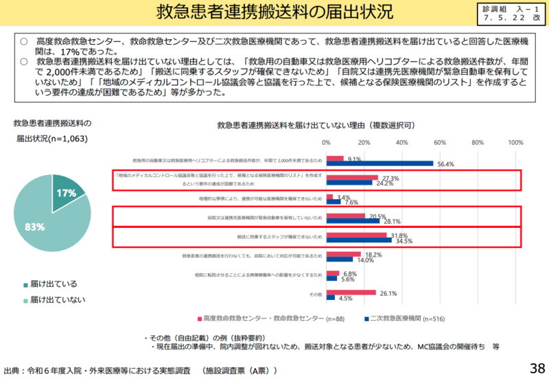 厚労省のデータによると、救急患者連携搬送料の届出は限定的です。診療側の大田委員は、「要件が厳しく届出が進んでいない。不要と思われる要件は緩和すべき」と主張。また、搬送元だけでなく、受け入れ側の医療機関への評価も設定すべきだと提案しました 。