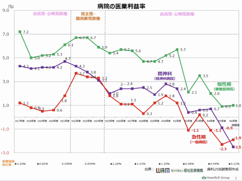 また会見では、福祉医療機構(WAM)のデータを基にした病院経営の現況も報告されました。2024年(令和6年)の速報値において、一般病院の58.3%、精神科病院の56.9%が赤字であることが示されました。 医療利益率についても、急性期一般病院でマイナス1.9%、精神科病院でマイナス2.5%と軒並み低下しており、経常利益率も急降下している状況です。