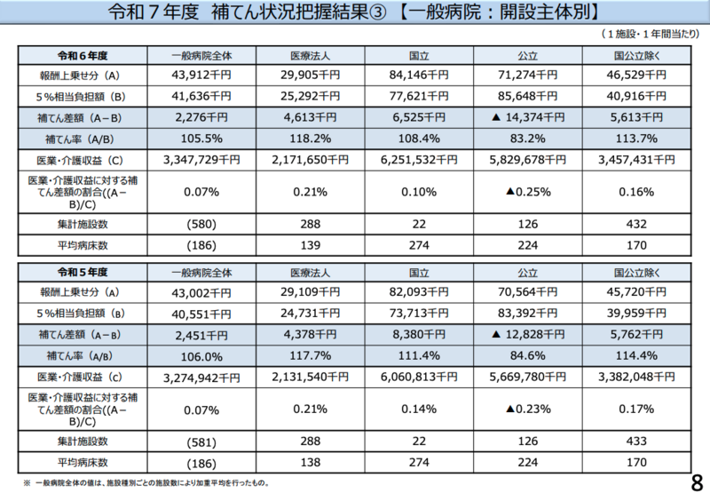 これに対し望月議長は、「4病院団体協議会(4病協)で行った調査データとはだいぶニュアンスが違う」と指摘しました。特に、国立病院(108.4%)や医療法人(118.2%)が高い補てん率を示した一方で、公立病院は「83.2%」と極めて低い数値となっている点に触れ、「平均病床数などの違いはあるものの、実感として(厚労省のデータは)現場の肌感覚とだいぶ違うのではないか」と疑問を呈しました。