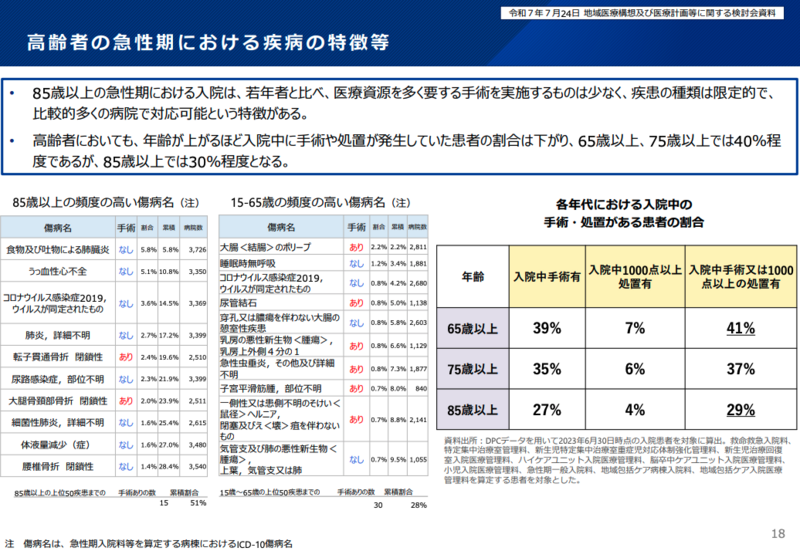 具体的には、75歳以上で「急性期」と見込まれる患者のうち、5割を引き続き急性期の需要として計上し、残る5割を「包括期」の需要として計上します。この配分の根拠として、75歳以上患者の約4割で手術や処置が実施されている実態が挙げられました。85歳以上では手術・処置の実施割合が約3割にとどまるというデータも示されています。